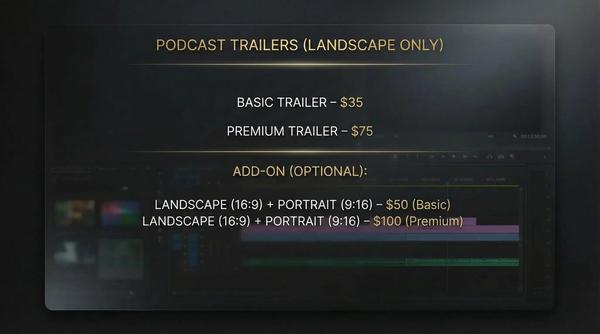 ← Back PODCAST TRAILER Option Basic Trailer (Landscape Only) - $35.00 Premium Trailer (Landscape Only) - $75.00 Basic: Landscape (16:9) + Portrait (9:16) - $50.00 Premium: Landscape (16:9) + Portrait (9:16) - $100.00 $35.00 Add to Cart